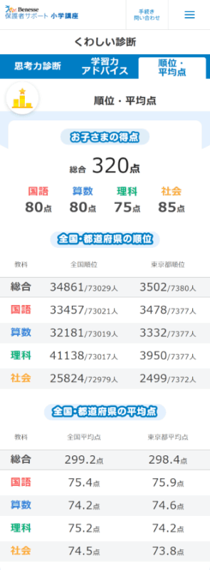 順位や平均点もわかります。結構本格的で、問題の難度は学校のカラーテストよりも難しめ。