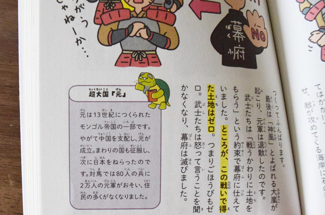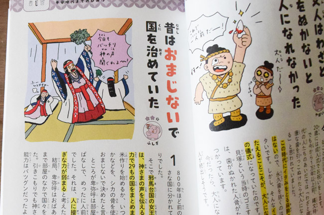 雑学のように歴史を紹介していて、つい読み進めたくなる内容になっています。必要な部分は太字かつマーカーでライン。漢字にはフリガナが振ってあるため、小学生低学年でも読み進めることが可能です。