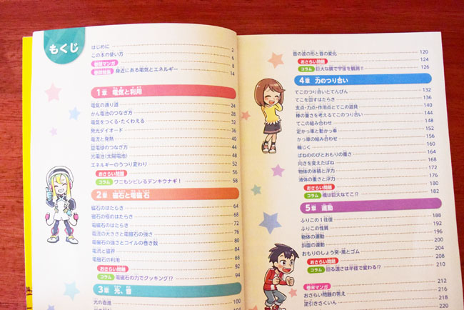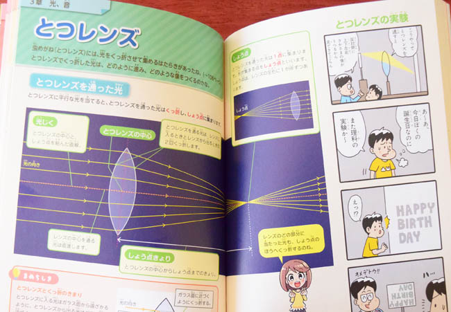 既に学校の理科で習った事、まだ習っていない事が、マンガと図解付きの文章で描かれています。机に向かっての勉強!とならないように、さらっと手に取ってパラパラめくり、へぇ〜ってなって欲しかったのですが、我が家の子供たちには見事にハマったようでした。
