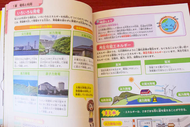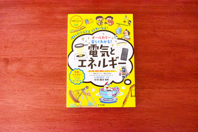 黄色い表紙が目印の「楽しくわかる! 電気とエネルギー楽しく学習!」。手で持てるほどで、空き時間に読める手頃なサイズ。215ページほどあり、結構分厚いのが特徴です。