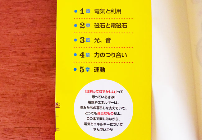 内容は5章に分かれていて、電気関係は始めの方にまとめられています。後半は力や運動に関してです。
