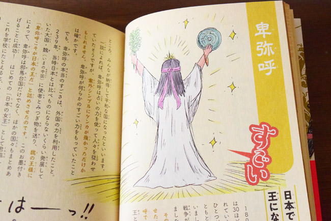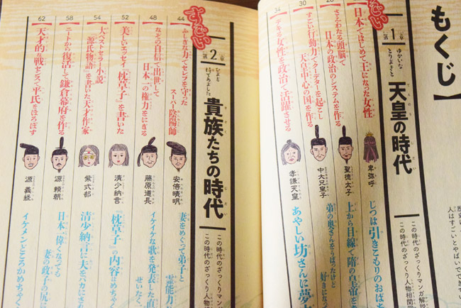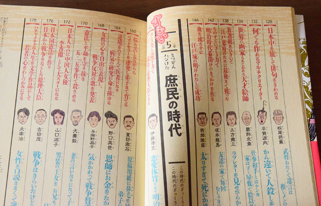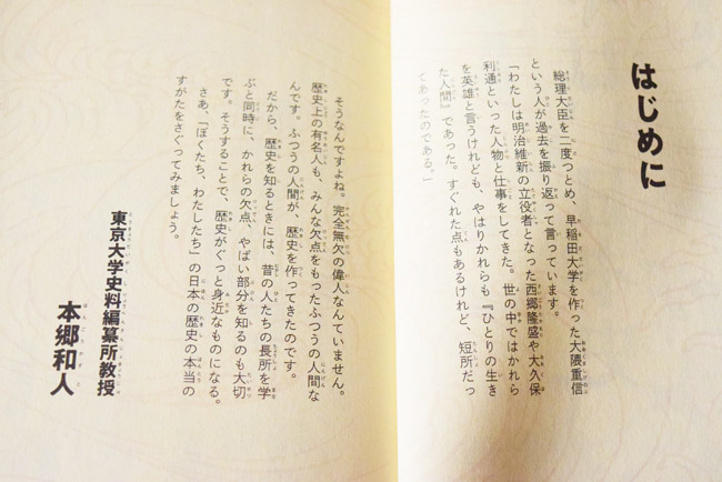 はじめの方には歴史の教科書に書かれている功績を紹介。教科書よりも詳しく紹介されていて、小学生でも読めるようフリガナがふってあります。ただし、文字は文庫本サイズと細かいため、普段から本を読みなれている子供でないと厳しいかもしれません。